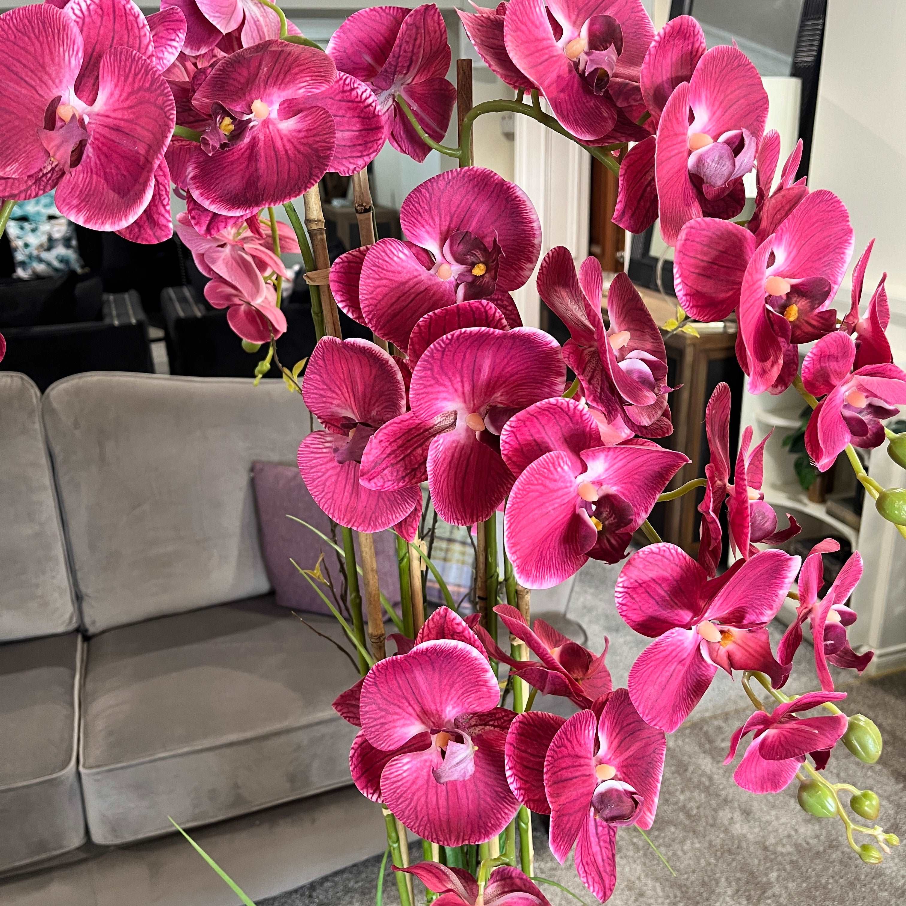 Introducing our stunning 1.2m Pink Orchid, a masterpiece of artificial botanical design, gracefully presented in a ceramic pot.