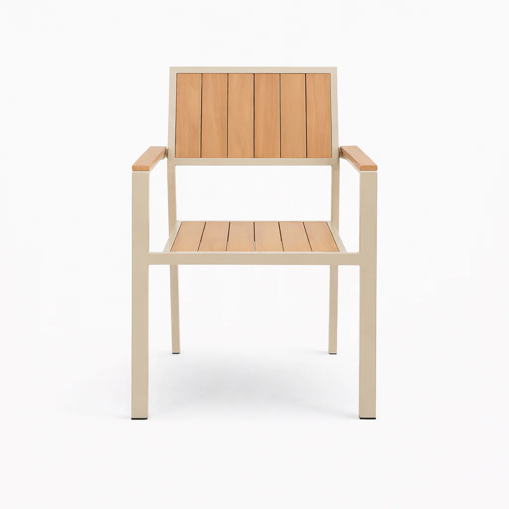 The Darby 7-Piece Outdoor Dining Set blends warm natural tones with contemporary outdoor design. Featuring a spacious rectangular dining table and six coordinating chairs, this modern garden furniture set combines a beige-toned frame with wood-effect panel detailing for a stylish and durable outdoor dining solution.