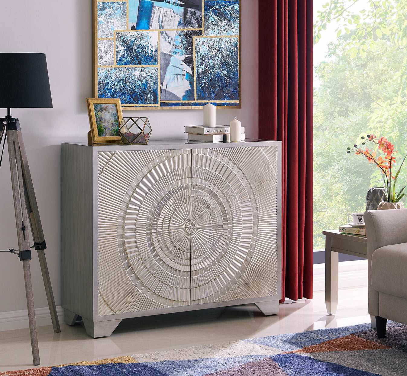 Introducing the Frenso 2 Door Silver Geometric Chest, a testament to the marriage of artistry and functionality. Crafted with geometric precision and adorned in a lustrous silver finish, this chest is an embodiment of modern luxury. Its soft-closing doors provide an effortlessly graceful experience. Discover a piece that elevates your living space, making a statement of opulence and sophistication.