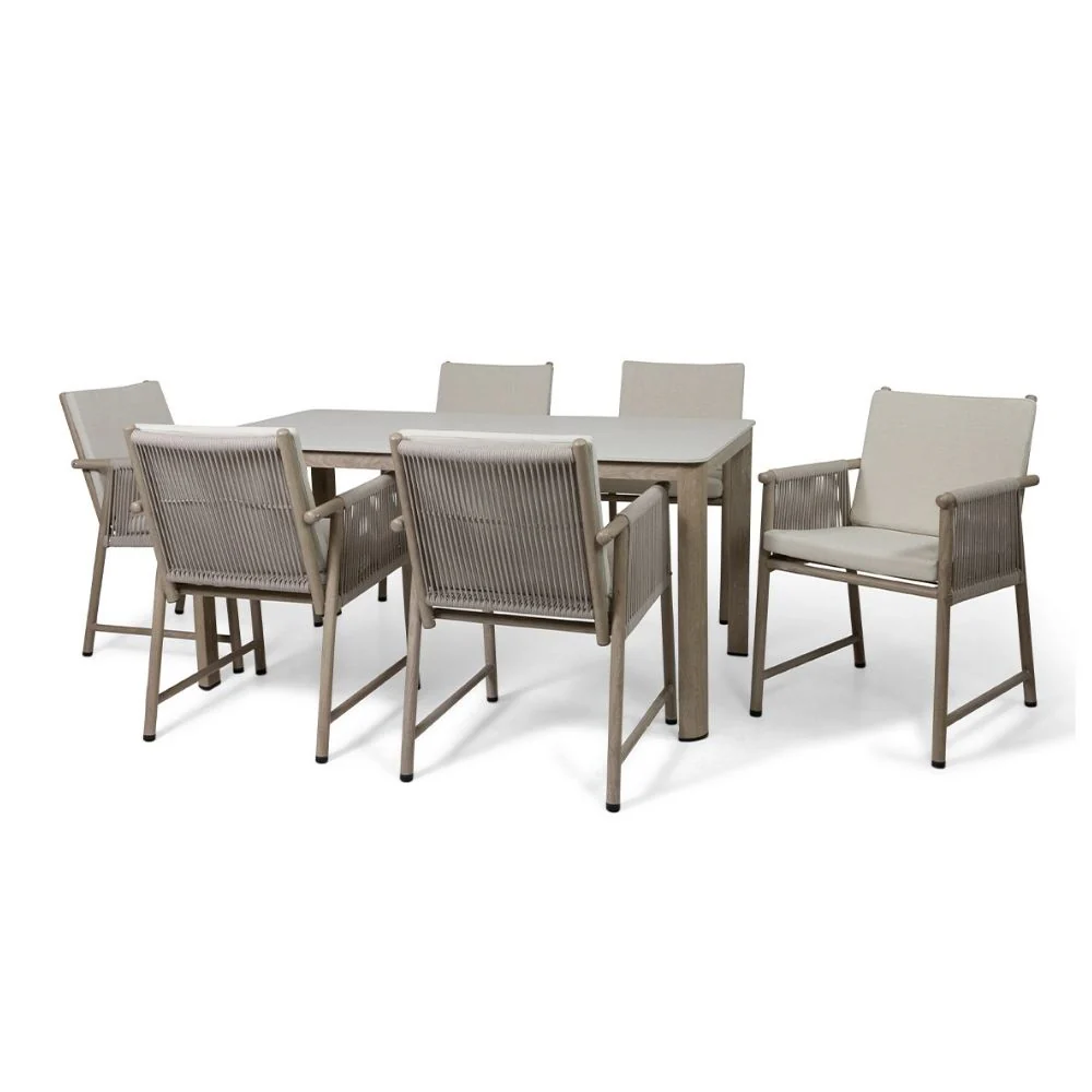 Bring contemporary outdoor dining to your garden with the Heuston 7-Piece Outdoor Dining Set. Featuring a spacious dining table and six coordinating chairs, this modern garden furniture set blends warm wood-effect tones with sleek grey finishes and rope-woven detailing for a refined, on-trend outdoor look.