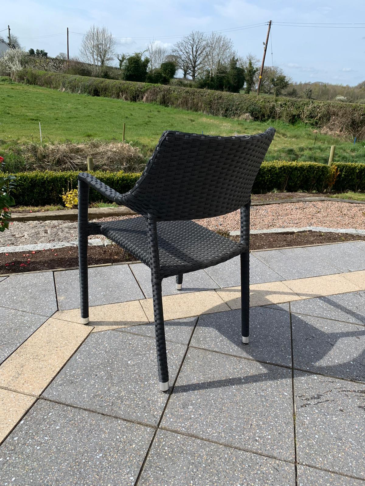 This rattan armchair offers the perfect place to relax in comfort outdoors. The black pollyrattan will compliment any garden setting but is also robust so will stand the test of time, so too will the strong aluminium frame complete with rubber feet to prevent deterioration to the bottom of the legs. Multiple chairs can be stacked atop of one another for compact storage when not in use.