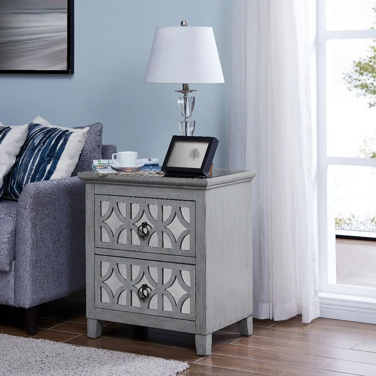 - Elegant Finish: Grey distressed paint with antique aged glass panels for a chic look.