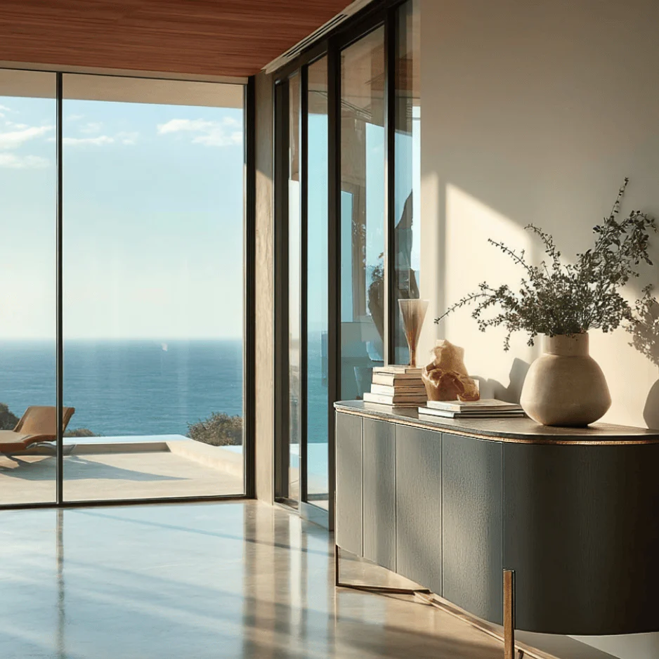 Refined bronze accents enhance the overall design, adding a subtle touch of luxury and modern flair. Behind four spacious doors, the sideboard provides generous storage for tableware, linens, books, or decorative objects, helping you keep your home organized while maintaining a polished look.