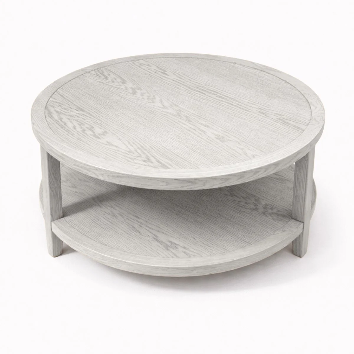 Bring effortless calm and sculptural simplicity to your living space with this round coffee table. Finished in a soft pale grey wood grain, its generous surface and open lower shelf balance style with everyday practicality—perfect for modern, relaxed interiors.